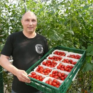 Denn nur vier Kilometer von unserem Markt entfernt, baut Siegfried Eberlein für uns in Bielefeld-Babenhausen verschiedene Tomatensorten an. Und das auf ganz natürliche Art und Weise. Auf chemische Hilfsmittel und den Einsatz von Gülle verzichtet der Gemüsebauer dabei ebenso wie auf Trinkwasser. Hummelvölker und ein 400.000 Liter fassender Regenwassertank sorgen dafür, dass das Gemüse unter natürlichen Bedingungen reift. Statt auf Substrat wachsen die Pflanzen auf heimischer Erde. Erst wenn sie reif sind werden die Tomaten rot geerntet, müssen also nicht nachreifen und haben so ihr volles Aroma.